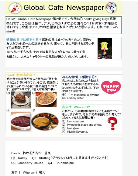 “Thanks giving Day ( 感謝祭 )”について、どのような日なのか学びました。