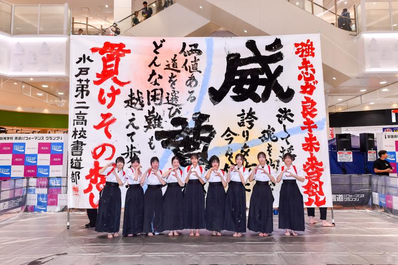 水戸二高書道部としては昨年度から続き、2回目の出場となりました。昨年度の想いを引き継ぎ、力強いパフォーマンスを披露することができました!練習時間があまりない中での挑戦となりましたが、2年生同士よく協力しながら完成まで頑張りました。今回の経験をこれからのパフォーマンスにも活かしていきたいと思います!引き続き応援よろしくお願いいたします。