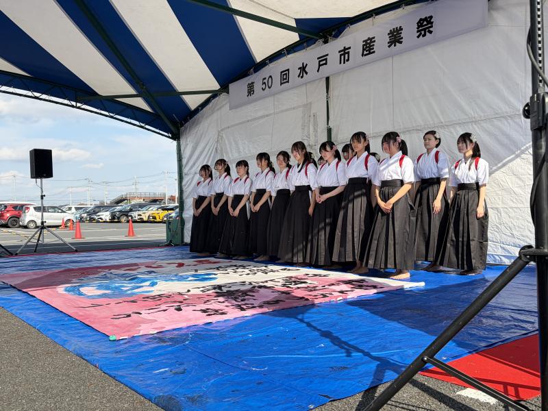 水戸二高書道部としては初めての参加となりましたが、とても天気が良い秋晴れの中でのパフォーマンスとなり、部員一同とても楽しみながら堂々とパフォーマンスすることができました!1・2年生全員で今回のパフォーマンスに臨んだため、連携等大変なこともありましたが声を掛け合いながら練習し、日頃の練習成果を発表できるとてもよい機会となりました。
